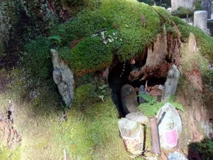 その石鳥居に苔が生えます。そこへ木が生えます。